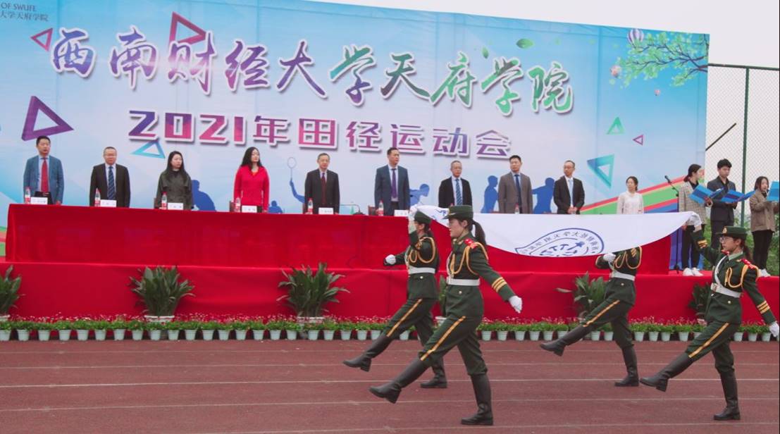 2021年4月22日,在西南财经大学天府学院绵阳校区春季运动会开幕式上,国旗班的同学们踏着整齐的步伐,喊着响亮的口号,出色的完成了此次运动会开幕式的出旗仪式,也获得了全校师生的一致好评。